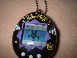 Zum 1. Mal hatte ich meinen Devil in der Hand! Er sah echt super aus in seinem schwarz mit den silbernen Flügeln! Ich zog an dem Batteriestreifen. Die Sounds klangen gar nicht wie das piepsen eines Tamagotchis. Zuerst dachte ich, es sei kaputt. Aber nein! Das gehörte so und es hörte sich gut an *g*. Es erschien eine Rauchwolke, aus der kurze Zeit später ein kleines Wesen erschien. Nun konnte ich die Uhrzeit einstellen.