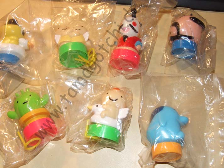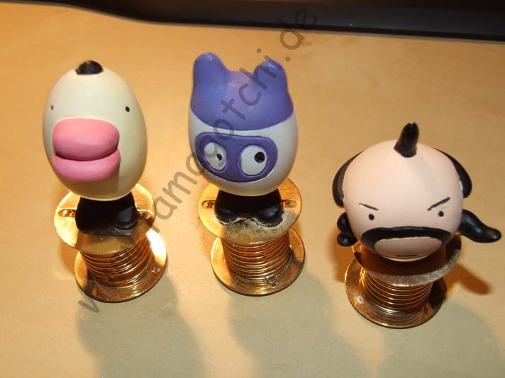 Das erste sind Tamagotchi Stempel mit süssen Figuren^^ Im 2. Bild seht ihr Wackelfiguren die auf Sprungfedern stehen. Was das 3. darstellen soll, weiß ich ehrlich gesagt nicht. Einfach eine Art Bild oder so. Dann kommt eine Tamagotchi Sammelfigur und zum Schluß 4 Plüschfiguren zum Knuddeln.